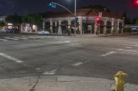 A night view of a classic architecture building in Los Angeles, California. The yellow lights create a warm ambiance as pedestrians cross the street in front of cafes and restaurants. The urban design of the city creates a dynamic and lively atmosphere in this art district.
