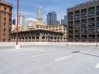 Concrete parking deck in Los Angeles with classic architecture and open space. Clear sky highlights the urban landscape of California. A quintessential city day view.