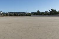 A young boy enjoys skateboarding on the concrete lot in Los Angeles, California. The clear sky highlights the vibrant city life. The open space provides a perfect spot for recreational activities in this urban setting.