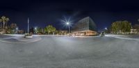 an empty parking lot with a lit up building and lamp posts in the middle of the road