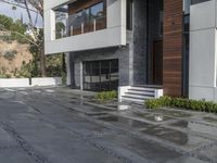 A modern condominium building in Los Angeles, California. The sleek concrete facade stands out against the open space. Wet surface reflects the day's sunlight, creating a striking contrast.