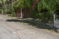 a person walking down the street past an gate, and a house in the background