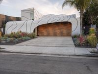A low, modern residential property in Los Angeles, California. The curved driveway with a decorative walkway guides you to a futuristic architectural marvel. The contrast of the clean lines against the dawn sky creates an emotional cityscape.