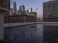 A stunning view of the Los Angeles skyline at dawn with modern architecture, skyscrapers, and office buildings. The cityscape reflects on the wet rooftop and the nearby river, creating a captivating scene. This urban metropolis is located in California, USA, and is known for its iconic landmarks and vibrant city life. The image showcases the vibrant city of Los Angeles, with its bustling downtown area, classic and modern architecture, and the beautiful coastal views.