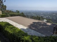This is an image of the Los Angeles skyline, captured from an elevated viewpoint in Beverly Hills. The clear sky provides a picturesque backdrop for the cityscape, with its high-rise skyscrapers and architectural landmarks. In the foreground, there is a spacious walkway lined with cobblestone and surrounded by lush green grass and trees. The property features a swimming pool, surrounded by wood flooring and overlooking the stunning hillside landscape. This photo showcases the urban design and natural beauty of Los Angeles, making it an ideal city for recreation and relaxation.