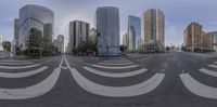 A snapshot of downtown Los Angeles, California. The classic architecture and modern skyscrapers create a stunning cityscape. The empty road leads to an intersection with buildings and a clear sky as the backdrop.