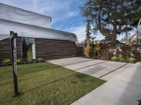 A modern residential villa in Los Angeles, California. Its sleek and futuristic architecture stands out against the suburban landscape. The concrete surfaces and well-manicured lawn create a contemporary entry into city life.