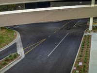 a view of a road and an overpass with traffic passing through it by buildings
