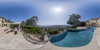 A tranquil suburban scene in Los Angeles, California. The pool and house are surrounded by lush green grass and tall palm trees. Classic architecture and clear blue skies complete the picture-perfect residential oasis.