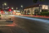 Nighttime in Los Angeles, California. The city lights create a beautiful blur as traffic passes through the classic architecture. Stoplights and street lights illuminate the urban design of the bustling art district. Perfect for a night out at a restaurant or cafe.