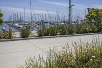 A sunny day in Los Angeles, California. The picture captures the vibrant architecture and residential areas. The clear sky and vegetation create a peaceful atmosphere. The image also features a walkway along the water and a boat docked at a pier.