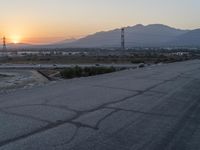 A suburban road in Los Angeles, California, with a red stop sign. The sun sets over the desert mountain backdrop, creating a picturesque evening landscape. The clear sky and visible sun add a touch of sunshine to the scene.