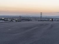 An empty highway in Los Angeles at sunset, surrounded by hills and power lines. The suburban landscape contrasts with the industrial infrastructure. A tranquil moment in the bustling city of Los Angeles.