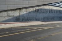 This image captures the urban atmosphere of Los Angeles, California. A man wearing a hat can be seen skating under an overpass on the side of a road. The modern architecture and concrete surfaces give the city a contemporary feel. The open spaces, lined with asphalt and curbs, create a sense of urban design. The hard shadows and mural on the wall add to the city life ambiance. This photo represents a typical day in the bustling city of Los Angeles.