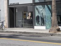 This is an image of a modern architectural building with a glass facade and a row of windows. The building is located in the vibrant city of Los Angeles, California, USA. Surrounding the building is a well-maintained road surface with lanes and curbs, lined with trees. The urban design includes shops and storefronts, creating a lively city life atmosphere. In the background, there is a crosswalk and zebra crossing for pedestrians to safely navigate the area. This photo captures the essence of urban living in Los Angeles, particularly on Abbot Kinney Boulevard near Venice Beach.