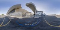 A 360-degree shot of the urban landscape in Los Angeles, California. Modern architecture lines the streets, with parking lots and office buildings dominating the scene. The blue sky and sunshine create hard shadows, enhancing the city life experience.