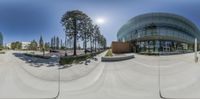 A fisheye lens photo captures the exterior of a modern building in Los Angeles. The building features a unique design with many windows, some of which are half-empty. The clear sky and concrete surfaces create a striking urban landscape.