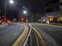 A dark urban night scene in Los Angeles. The empty road is illuminated by the city lights and street lights. The absence of traffic adds an eerie vibe to the cityscape.