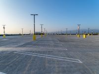 empty parking lot with parking lights and a streetlight in the distance to the right