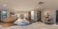 Modern architecture meets nature in this stunning Los Angeles villa. The interior design features a spacious living room with a yellow accent wall and a cozy bedroom with a wood floor. The light-filled rooms and stylish furniture create a perfect retreat.