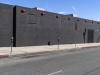 This is an image of an urban scene in Los Angeles, California, USA. The clear sky contrasts with the brick facade of a warehouse building in the art district. The city life is represented by the busy concrete and asphalt roads lined with buildings. The image captures the urban design and architecture of the city, with a focus on the brick walls and material properties. The black walls and factory-like structures add to the industrial feel of the area. This photo represents a typical day in the bustling city of Los Angeles.