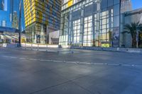 A deserted road in the business district of Los Vegas, USA. Futuristic architecture and modern storefronts create a low-rise urban landscape. Clear blue skies highlight the glass skyscrapers in the background.