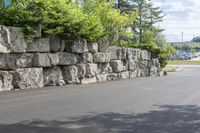 This stock photo features a low angle view of a residential street in Toronto, Ontario, Canada. The road surface is made of asphalt and is lined with lush green grass and trees. The infrastructure, including stone walls and a rock outcrop, adds a unique touch to the suburban setting. The image showcases the geology of the area, with the bedrock and rock formations visible. The lane and thoroughfare blend seamlessly with the surrounding environment, creating an idyllic scene of suburban living in Toronto.