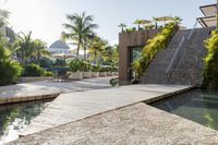 A modern residential building in Solidaridad, Mexico. The low architecture features straight roads, creating a unique POV. The courtyard with a swimming pool reflects the clear sky and the lush green landscape. A perfect vacation resort.