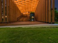 A low-profile wooden structure with stairs inside, illuminated by artificial street lights. The evening light casts a dark shadow against the clear sky and dark clouds. A perfect example of urban design and architecture.