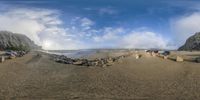 A low tide in California reveals a sandy beach with rocks in the foreground. The car parked on the sand adds a touch of contrast to the coastal landscape. The grey sky and calm waves create a gloomy atmosphere.