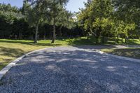 A scenic road in New Zealand's South Island, winding through a lush forest and surrounded by greenery. Clear skies bathe the landscape in sunlight, creating a serene and picturesque setting.