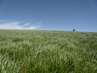 This stock photo captures a beautiful landscape in rural Germany. The image shows a vast open space with a clear sky and lush green grass surface. The field, surrounded by nature, is ideal for agriculture and offers a serene and peaceful atmosphere. Perfect for illustrating the charm of the European countryside.