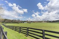 This image captures a serene landscape in rural Ontario, Canada. The lush green grass and trees provide a picturesque backdrop to the horses grazing in the large pasture. The open sky with fluffy cumulus clouds adds to the peaceful ambiance. A split-rail fence runs along the land lot, acting as a barrier and adding a touch of rustic charm. This photo showcases the beautiful agricultural scenery of Ontario, and represents a typical day in the countryside near Toronto.