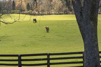 This image captures a scenic winter day in Ontario, Canada. The rural landscape features a wide expanse of grass surface dotted with bare trees. Animals are grazing in the open pasture of a farm property. The lush green vegetation contrasts with the snowy ground. A split rail fence and Armco barrier separate the land lot from the road. In the distance, the profile of Toronto can be seen. This photo showcases the natural environment and agriculture of Ontario, with incidental people enjoying the serene scene.