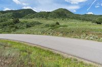 A scenic view of a road in Deer Creek Canyon Park, Colorado. The asphalt road winds through the lush green landscape and hills. The clear sky adds to the natural beauty of White Deer Valley.