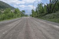 This is an image of a straight road surrounded by lush green landscape in Colorado, USA. The road surface is made of asphalt and gravel, perfect for an off-road adventure. The towering mountains and dense forest provide a picturesque backdrop. Clouds dot the sky, creating a beautiful contrast with the blue backdrop. This photo captures the natural beauty of Colorado and showcases the infrastructure of the region. The road, known as Ilium Road, is a popular thoroughfare in the area. Discover the wonders of this scenic mountainous region in the USA.