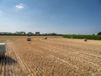 A lush green hay field in rural Germany with round bales of straw scattered across the landscape. Open space and clear skies create a peaceful and picturesque scene. A perfect day for agriculture in Europe.