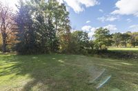 a yard with an artificial fence and lots of trees near the grass area and in the middle of the field