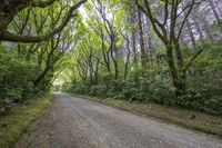 A lush green landscape with a winding road cutting through a dense forest. Vegetation, including trees with deciduous trunks and twigs, thrives alongside the road surface of asphalt and dirt. The forest is alive with the vibrant colors of nature.