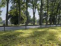 A lush state park in Berlin, Germany. The clear sky provides a stunning backdrop to the vibrant green vegetation and trees. Asphalt roads wind through the park, offering a recreational escape in the heart of the city. A spring day in Europe's natural environment.