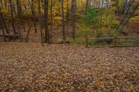 leaves spread out across a leaf - strewn forest floor in front of a bench and bench in the foreground