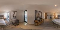 Spacious and modern bedroom in a luxurious villa in Los Angeles, California. The wooden floors and yellow accents add warmth to the room. The large windows allow plenty of natural light to fill the space, highlighting the stylish furniture and artwork on the walls.