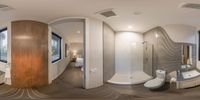 a bathroom is seen through a spherical image in a photo taken by a mirror with furniture