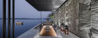 an outdoor fireplace sitting in the middle of a balcony overlooking a lake with a stone wall