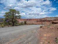 Off-road adventure in Capitol Reef, Utah. Dusty dirt roads wind through majestic landscapes, with gravel and sand streets adding to the natural charm. Clouds dot the sky on a beautiful day in the USA.