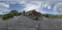 Rural road in Majorca, Balearic Islands, Spain. The sun shines on agricultural landscapes. A straight driveway leading to a farmhouse under a sunny daybreak sky. A serene European countryside scene.