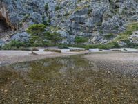 A scenic landscape in Majorca, Spain, showcasing a rock wall against the open space. The Balearic Islands offer diverse terrain with canyons and dirt surfaces. European gravel areas blend into the natural walls of this canyon.