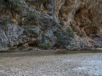 Daytime in Majorca, Spain, a rocky landscape with open spaces and gravel surfaces. Walls and rock formations create a canyon-like scenery. Nature in the Balearic Islands offers a unique European experience.