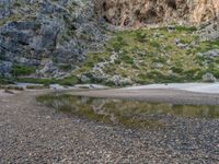 In Majorca, Spain, a rugged landscape with rocky walls and open spaces. Gravel and dirt surfaces enhance the natural beauty of this European canyon. The walls of Majorca stand tall under the clear day skies.