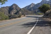 A scenic road in the Malibu Mountains of California, with winding curves and majestic mountain views. The asphalt road is adorned with yellow stripe lines. A perfect day for driving through nature's beauty.